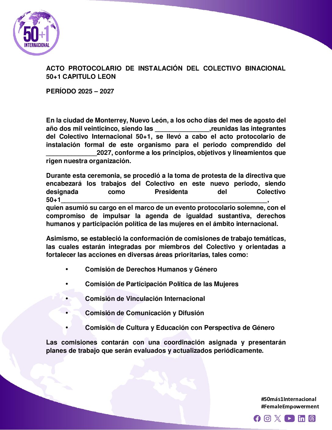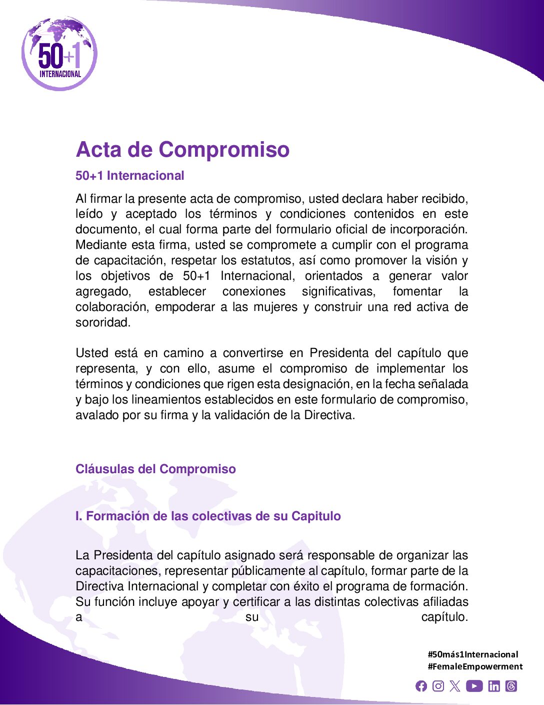 Descarga los documentos institucionales básicos que respaldan cada una de las acciones desarrolladas por los capítulos de 50+1 Internacional. Estos materiales han sido diseñados para facilitar la implementación, el seguimiento y la comunicación de iniciativas en cada territorio, asegurando coherencia, identidad y eficacia en el trabajo comunitario.